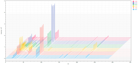 Heracles NEO超快气相电子鼻配备两个离子化检测器,即MXT-5低极性色谱柱和MXT-1701中极性色谱柱。为了更准确地比较样品间的差异,本研究使用了这两个检测器。对色谱柱检测结果进行分析,并将所有栀子果实样品的原始气相色谱图叠加,结果如图1和图2所示。
