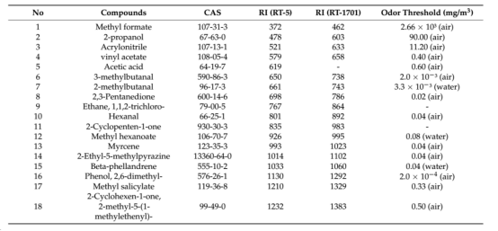 本研究利用Heracles Neo超快气相电子鼻技术分析六个批次栀子果实样品的VOCs,建立了栀子果实快速检测方法,共鉴定并分析了18种VOCs。经验证,PCA和DFA两个模型均发现不同产地栀子果实间存在明显的VOCs差异。这使得基于气味信息快速鉴别不同产地栀子果实成为可能。在六个批次栀子果实样品中,屈原栀子与其他样品差异最大,其甲酸甲酯、2-丙醇、丙烯腈等化合物含量较高,而己醛含量极低。金溪栀子和唐河栀子的VOCs相近,且金溪栀子中己醛和2,3-戊二酮含量较高。东乡栀子、宁乡栀子和樟树栀子样品的VOCs相对接近。唐河栀子中己醛含量较高,而宁乡栀子中乙酸含量较高。乙酸、3-甲基丁醛、2,3-戊二酮和己醛可能是导致不同产地栀子果实VOCs差异的重要化合物。