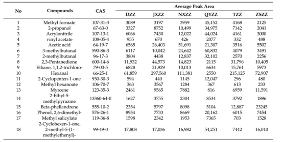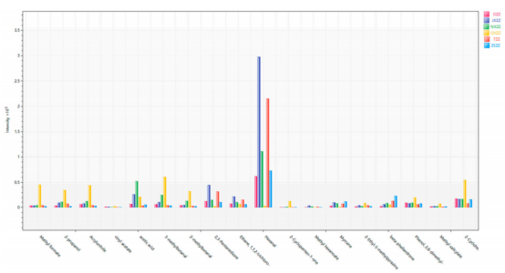 如表1所示,共鉴定出18种VOCs。为更直观地比较不同产地栀子果实样品中VOCs含量的差异,以VOCs为横轴、平均峰面积为纵轴绘制了差异化合物含量柱状图(如图5所示)。图5数据显示,栀子果实中VOCs的化学组成相对相似,但不同产地栀子果实的同一化学成分含量差异巨大,表明不同产地栀子果实品质存在差异。从柱状图可见,最显著的特征是屈原栀子,其甲酸甲酯、2-丙醇、丙烯腈、乙酸乙烯酯、乙酸和3-甲基丁醛等11种化合物含量最高,但己醛和月桂烯含量低于其他五个样品。宁乡栀子含量变化相对稳定,其乙酸含量高于其他样品。栀子果实中含量最高的化合物是己醛,其中金溪栀子样品含量最高,其次是唐河栀子。金溪栀子中2,3-戊二酮、乙烷和1,1,2-三氯乙烷含量高于其他样品,而樟树栀子中月桂烯和β-水芹烯含量高于其他样品。唐河栀子中2,3-戊二酮、乙烷、1,1,2-三氯乙烷和己醛含量相对较高,而其他化合物含量较低。东乡栀子未表现出任何显著高于其他栀子果实样品的成分,其化合物含量普遍低于其他样品。