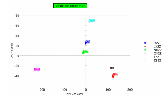判别因子分析(DFA)是一种确定个体所属类别的统计分析方法。它通过两个或多个已知类别的样本数据优化这种区分,最大化组间距离的同时确保用于定性判断的组内差异最小。在PCA基础上进行DFA,可通过减小组内差异来扩大组间差异,从而使不同产地的栀子果实样品更易区分。结果如图6所示。